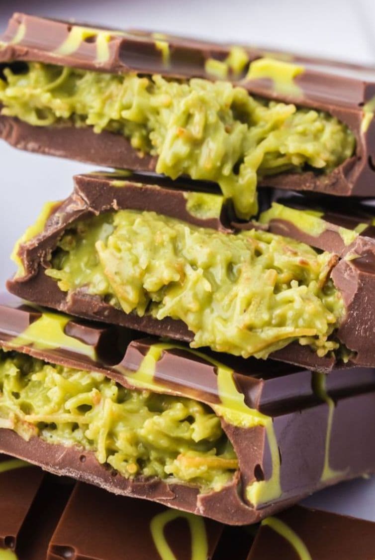 - Dátiles rellenos de pistache, cubiertos con chocolate amargo y decorados con oro comestible.